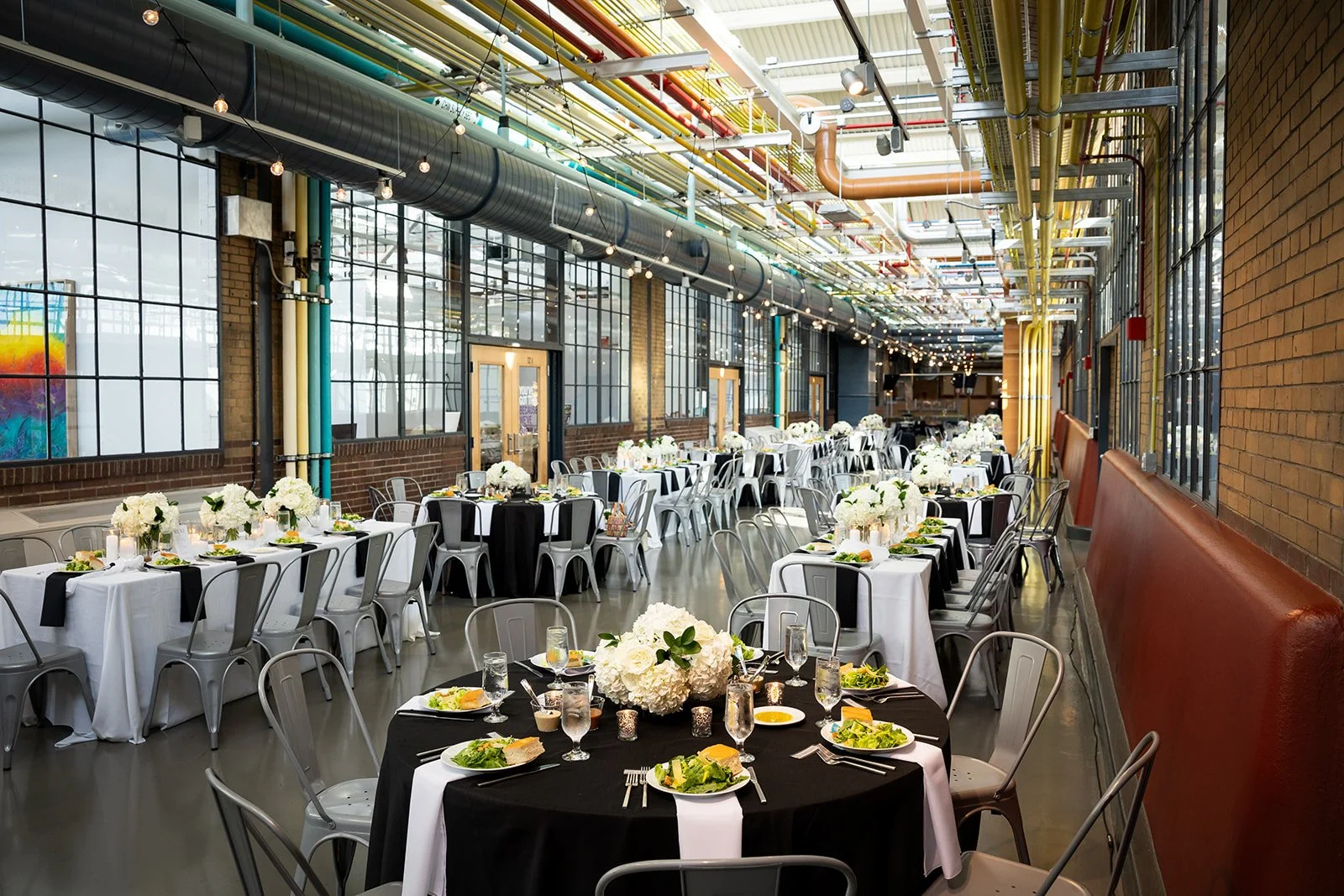 The Roadway, with its extra wide spaces and colorful pipes lining the ceiling, is a versatile location that can be transformed to suit your reception or cocktail hour needs.