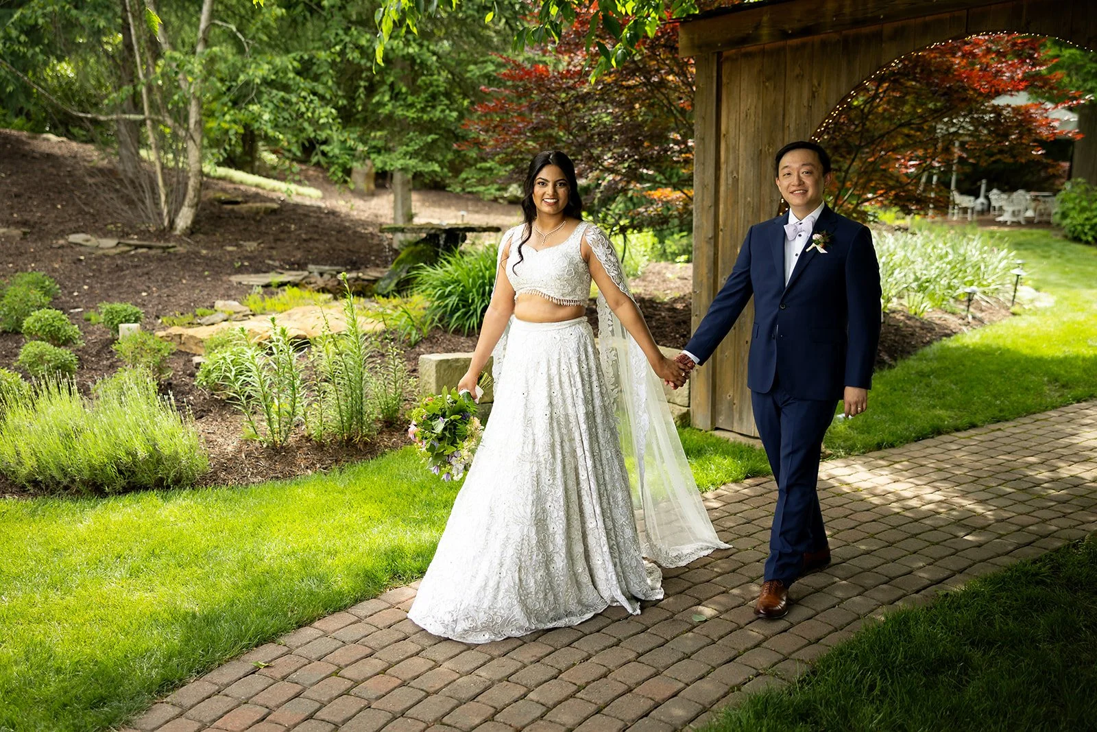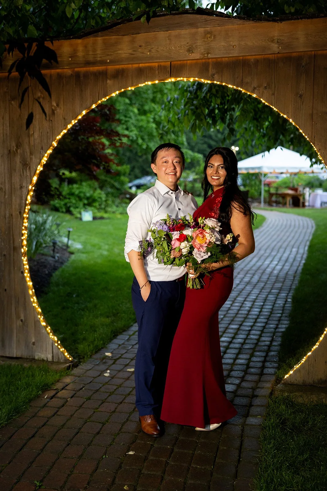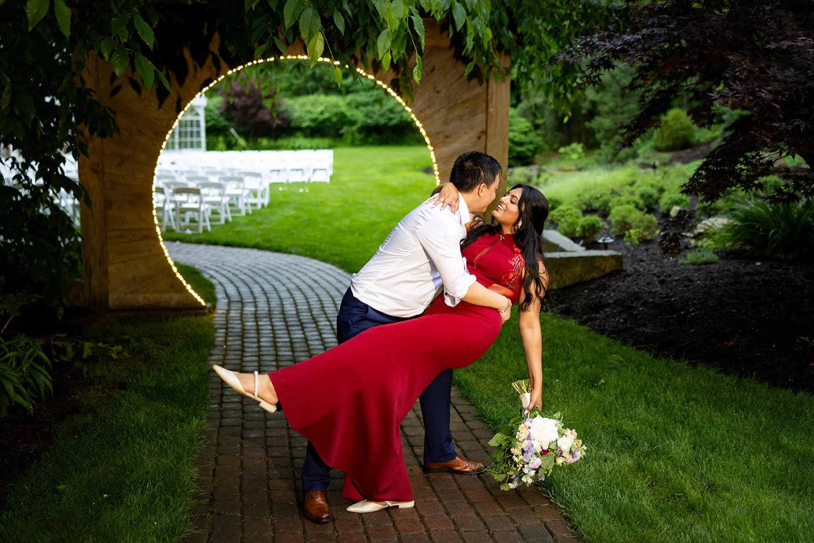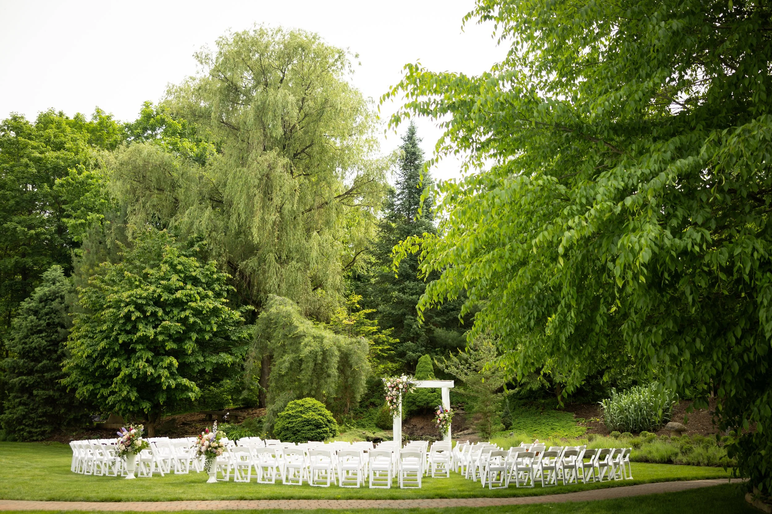 Guests can choose from a variety of enchanting ceremony locations, each carefully crafted to highlight the garden's diverse and romantic landscape. One particularly magical spot is the tranquil forested glen, where a charming cobbled brick aisle meanders through vibrant foliage, leading to a meticulously hand-hewn arch. This picturesque setting is embraced by a canopy of flourishing branches, creating a serene and intimate atmosphere perfect for exchanging vows.
