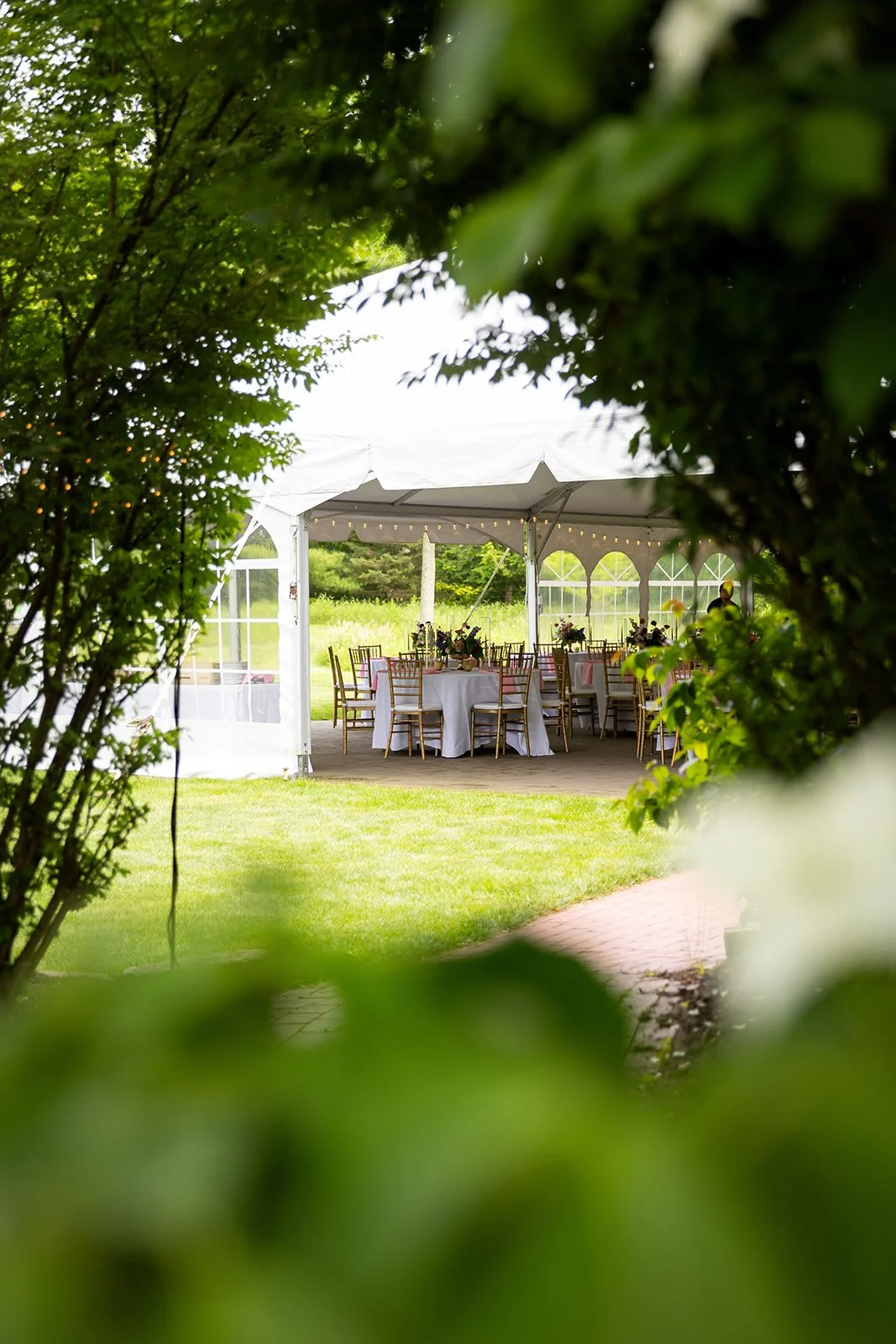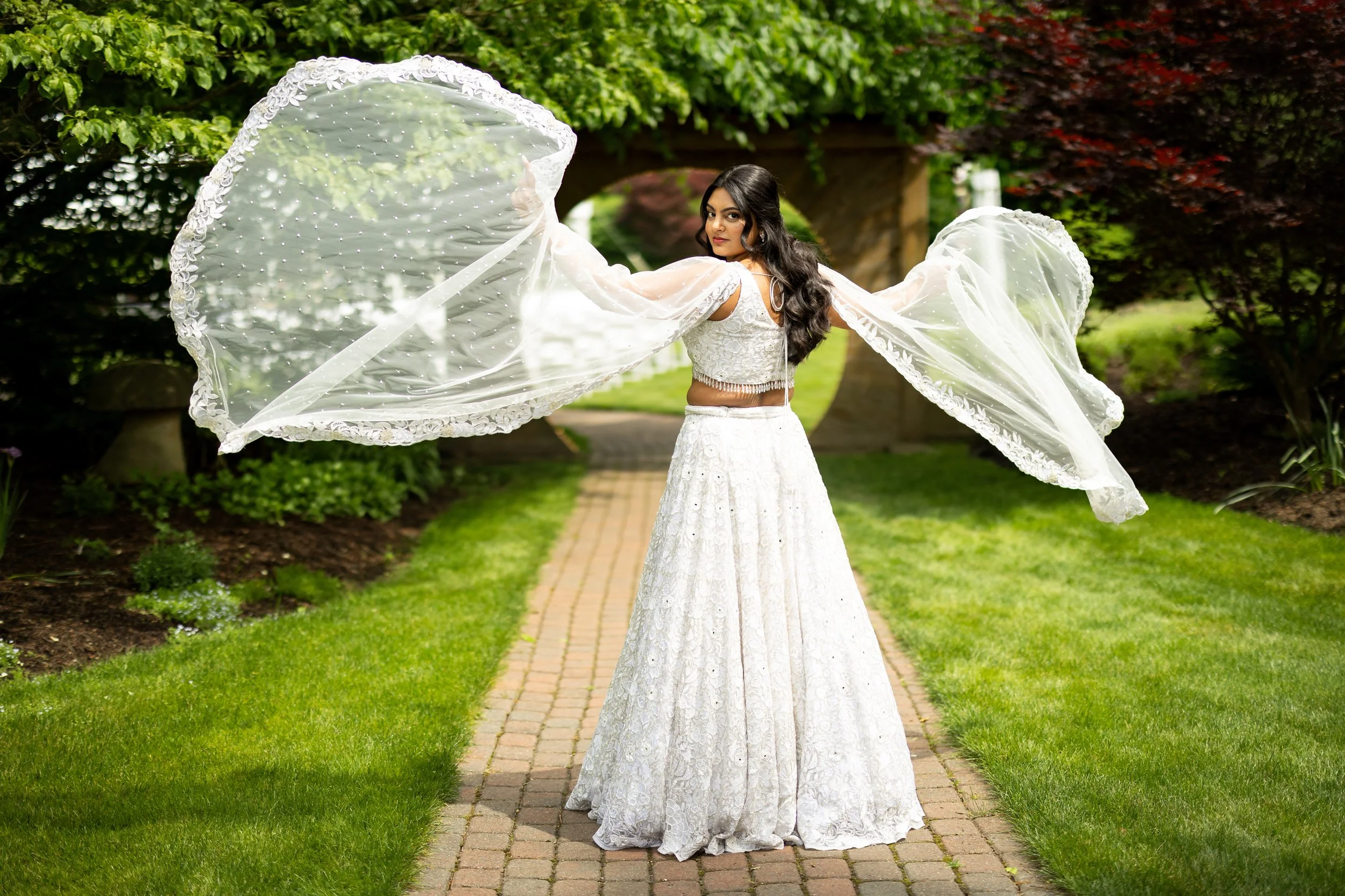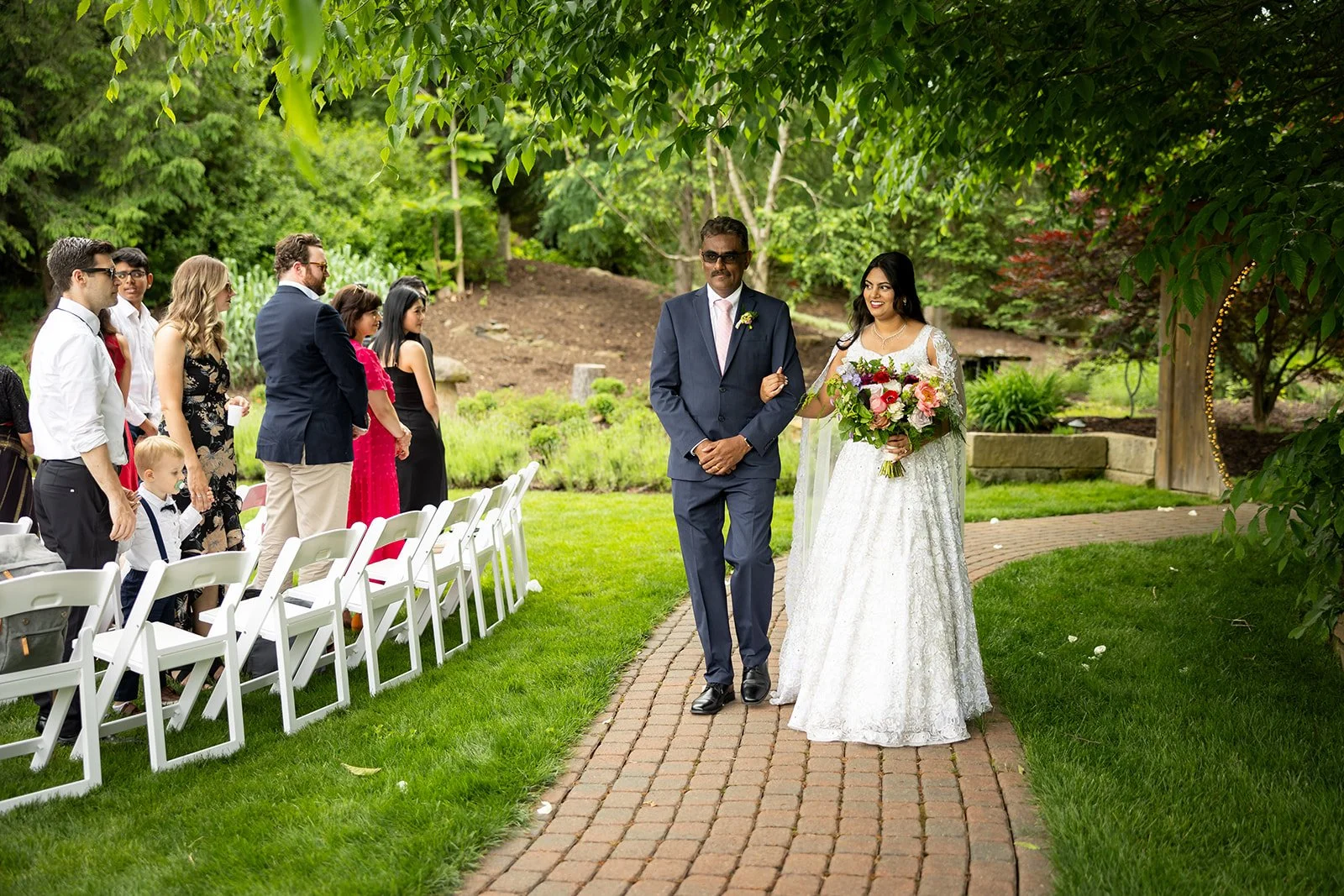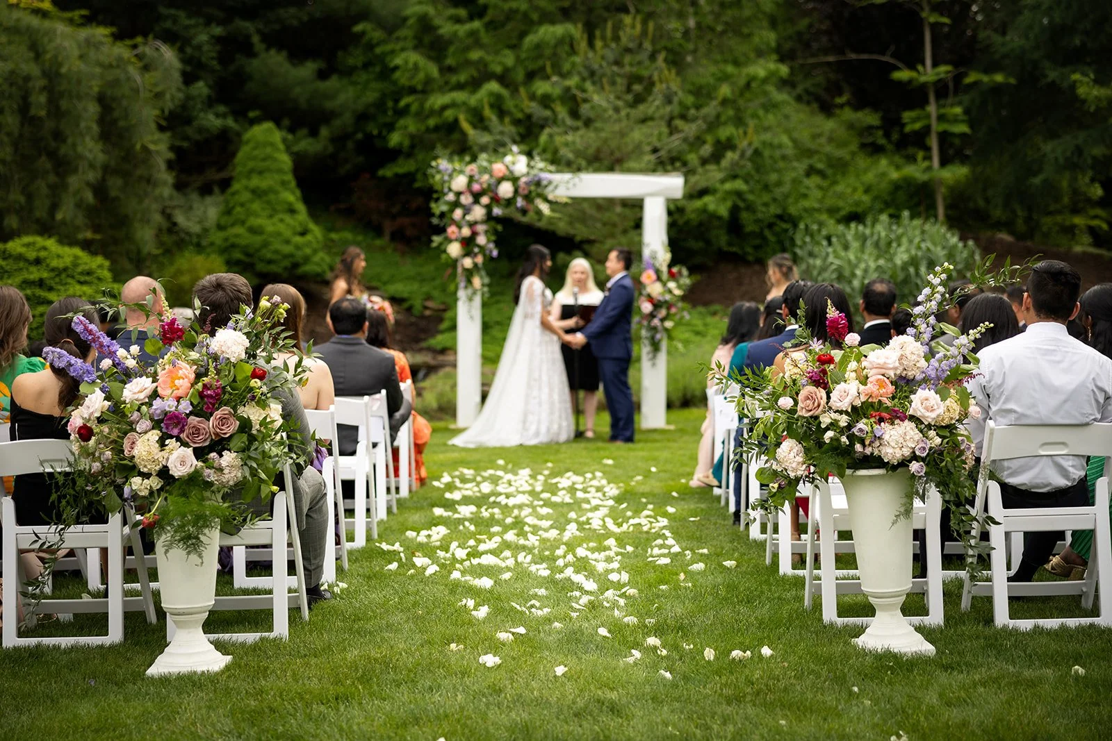 Guests can choose from a variety of enchanting ceremony locations, each carefully crafted to highlight the garden's diverse and romantic landscape. One particularly magical spot is the tranquil forested glen, where a charming cobbled brick aisle meanders through vibrant foliage, leading to a meticulously hand-hewn arch. This picturesque setting is embraced by a canopy of flourishing branches, creating a serene and intimate atmosphere perfect for exchanging vows.