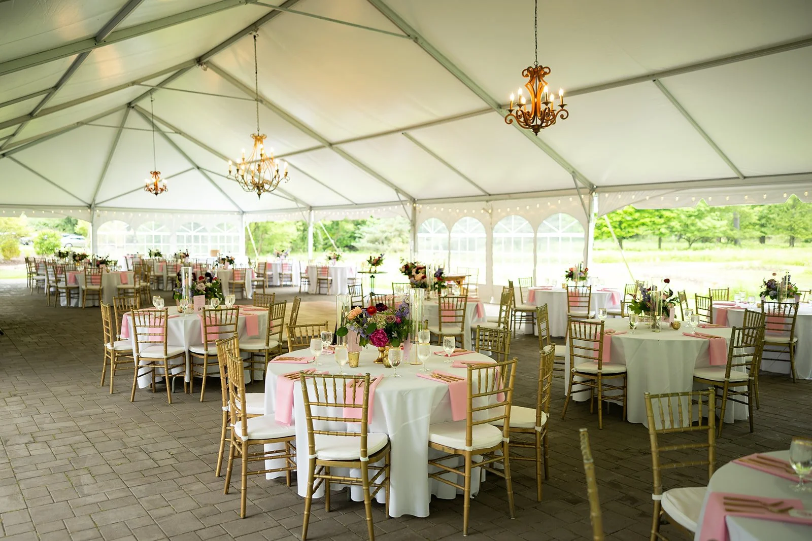 As the celebration unfolds, a dedicated games lawn offers the ideal backdrop for entertainment and mingling during the cocktail hour. Guests can enjoy lawn games, engage in friendly competition, or simply savor delightful hors d'oeuvres while soaking in the lush surroundings. Following this, the festivities move to the enchanting patio, adorned with a grand tent that features elegant drapery and twinkling chandeliers, illuminating the space with a soft, romantic glow. A central dance floor invites guests to lose themselves in the rhythm of celebration, dancing under the night sky and surrounded by the natural splendor that makes this venue truly unforgettable.