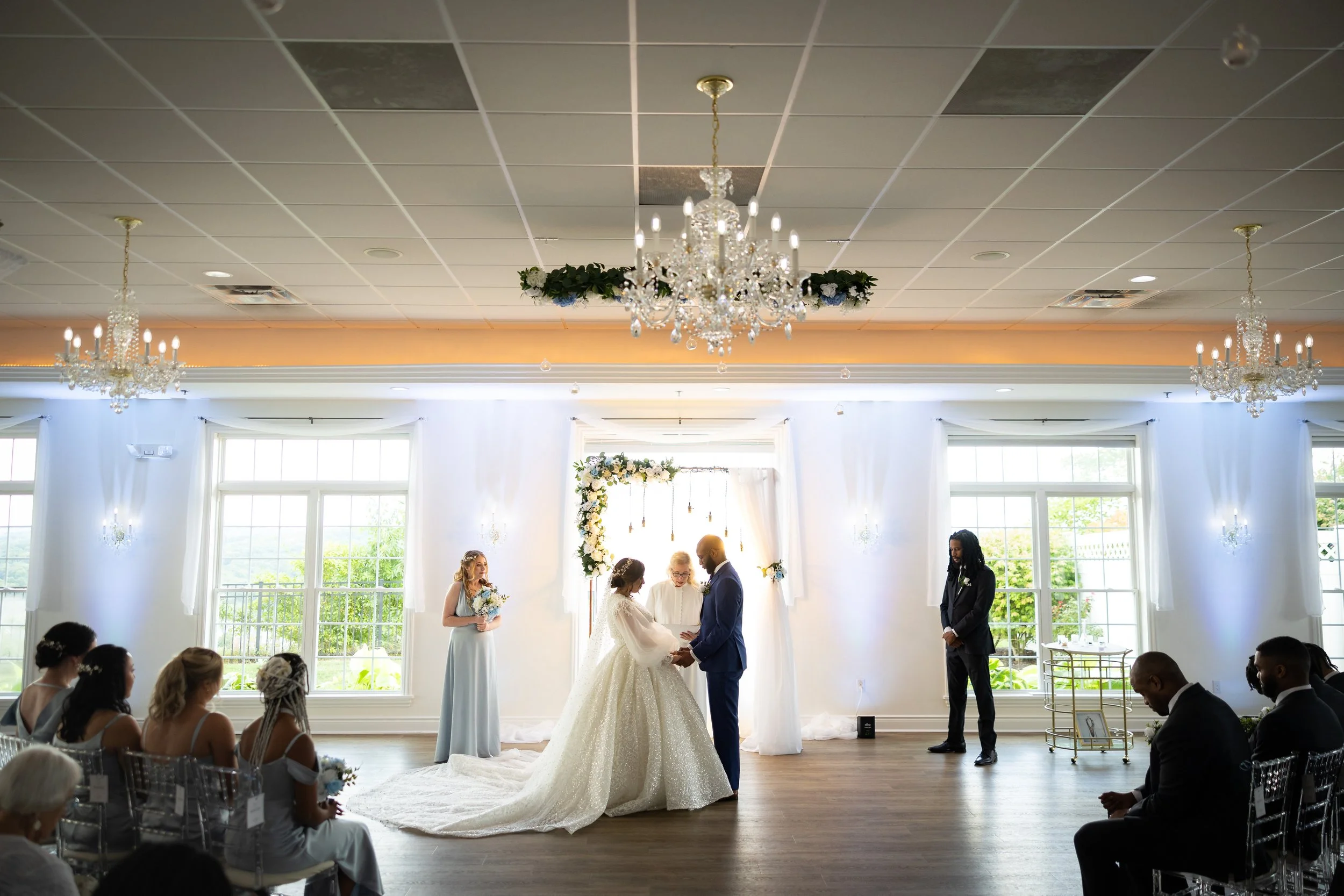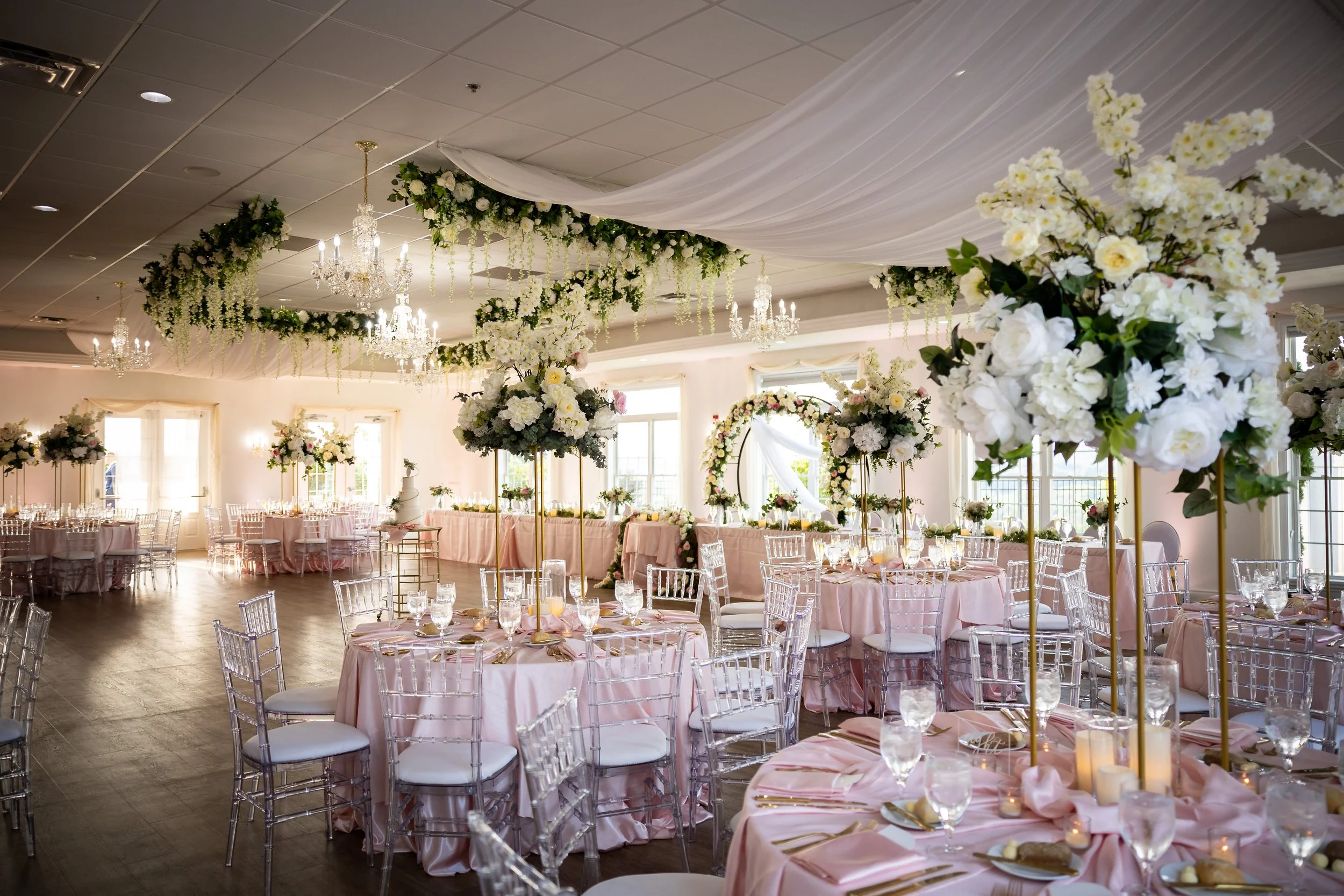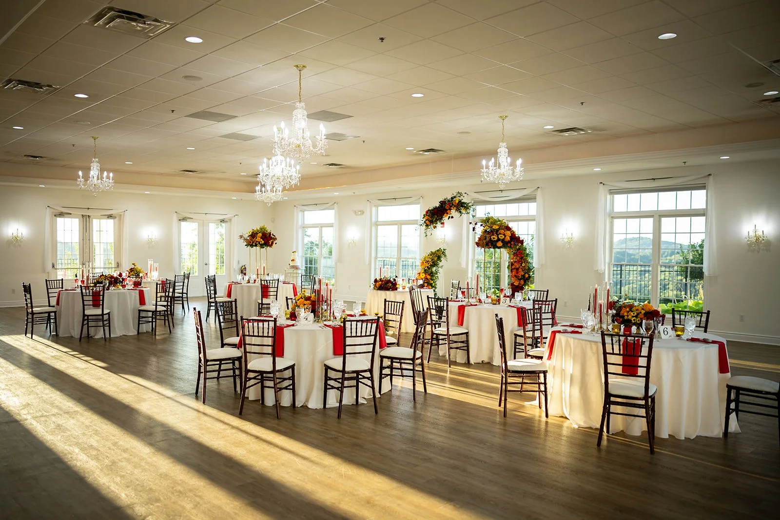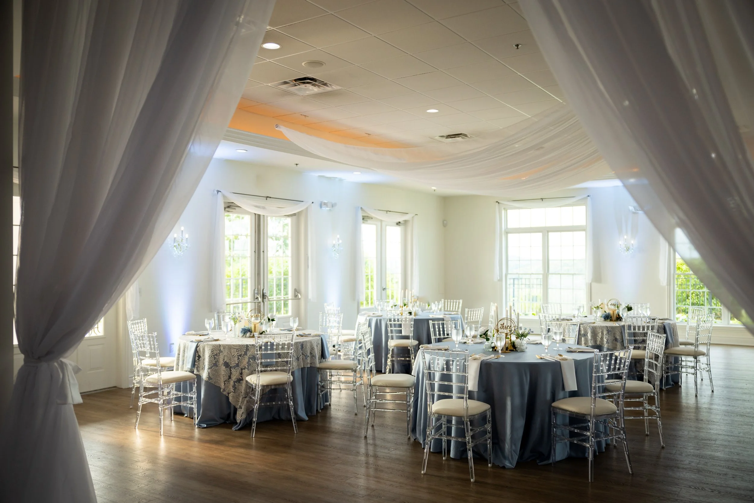 Inside, you are greeted by a Baby Grand piano and elegant marble floors. The picturesque winding stairway leads to the bridal suite and balcony, perfect for your getting-ready photos. The library is the ideal room for your cocktail hour or indoor ceremony. The Grand Ballroom, with its glowing chandeliers and seating for up to 250 guests, is a testament to its ability to accommodate your needs. Windows fill the room, allowing an abundance of natural light, and the space also features an outdoor patio with the most breathtaking views and stunning sunsets.