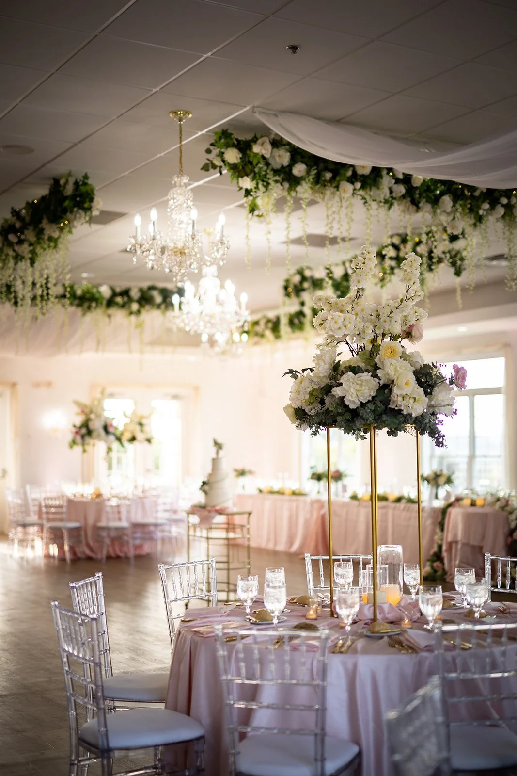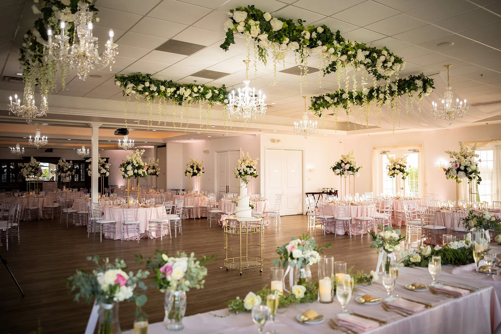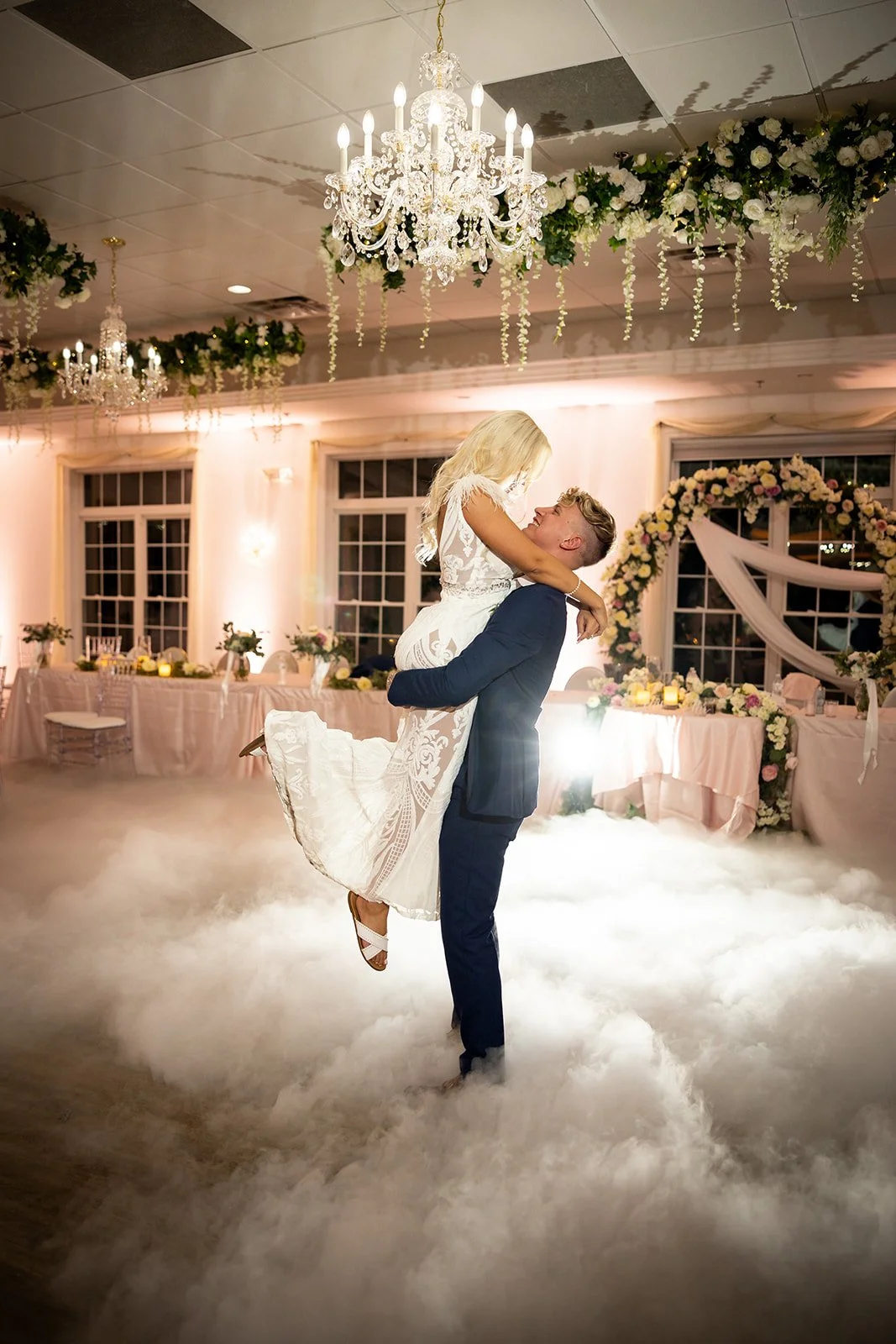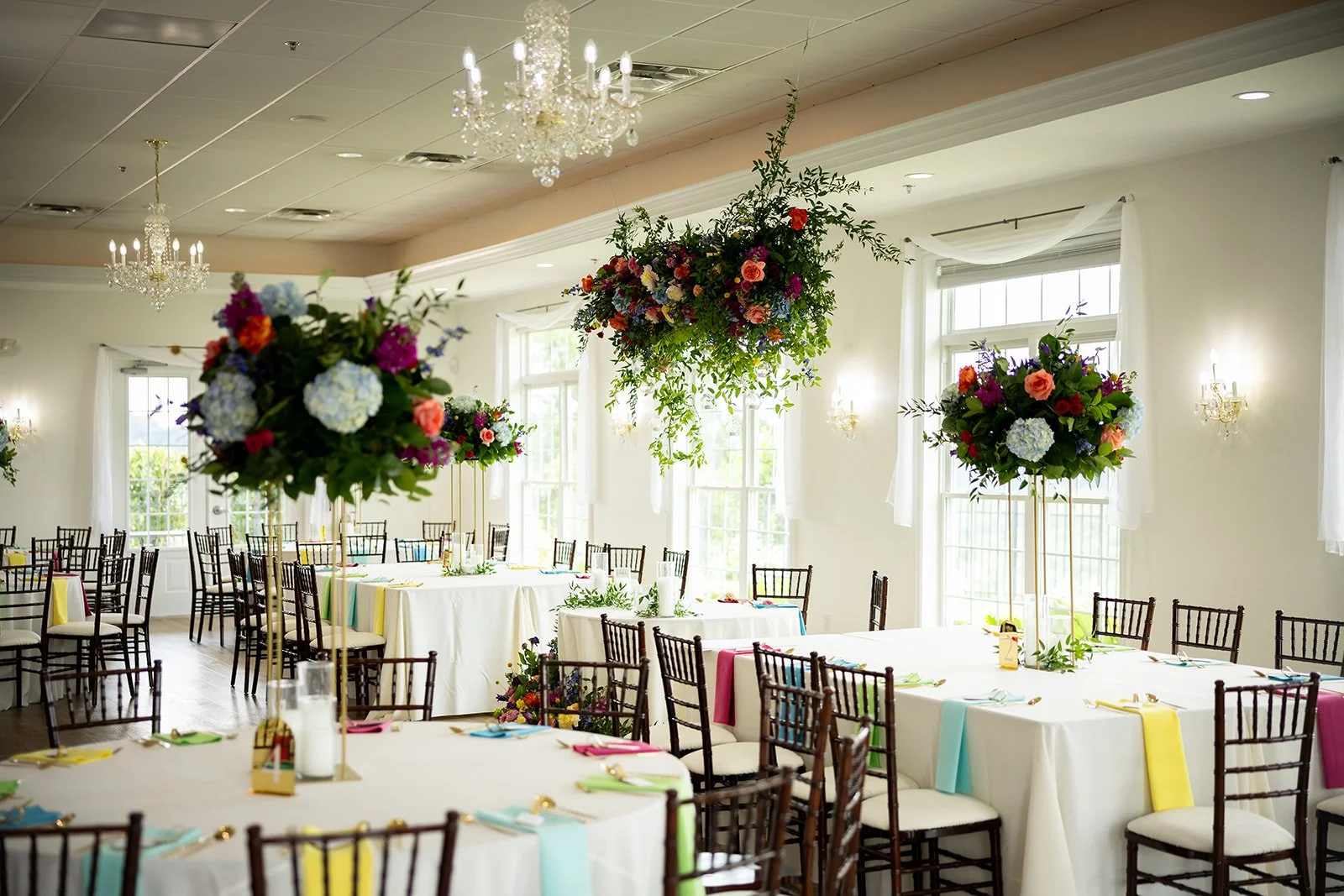 Inside, you are greeted by a Baby Grand piano and elegant marble floors. The picturesque winding stairway leads to the bridal suite and balcony, perfect for your getting-ready photos. The library is the ideal room for your cocktail hour or indoor ceremony. The Grand Ballroom, with its glowing chandeliers and seating for up to 250 guests, is a testament to its ability to accommodate your needs. Windows fill the room, allowing an abundance of natural light, and the space also features an outdoor patio with the most breathtaking views and stunning sunsets.