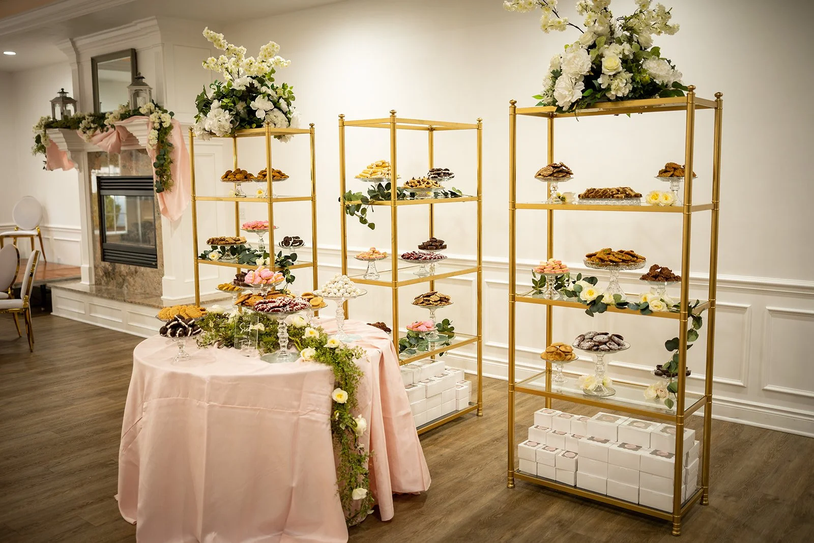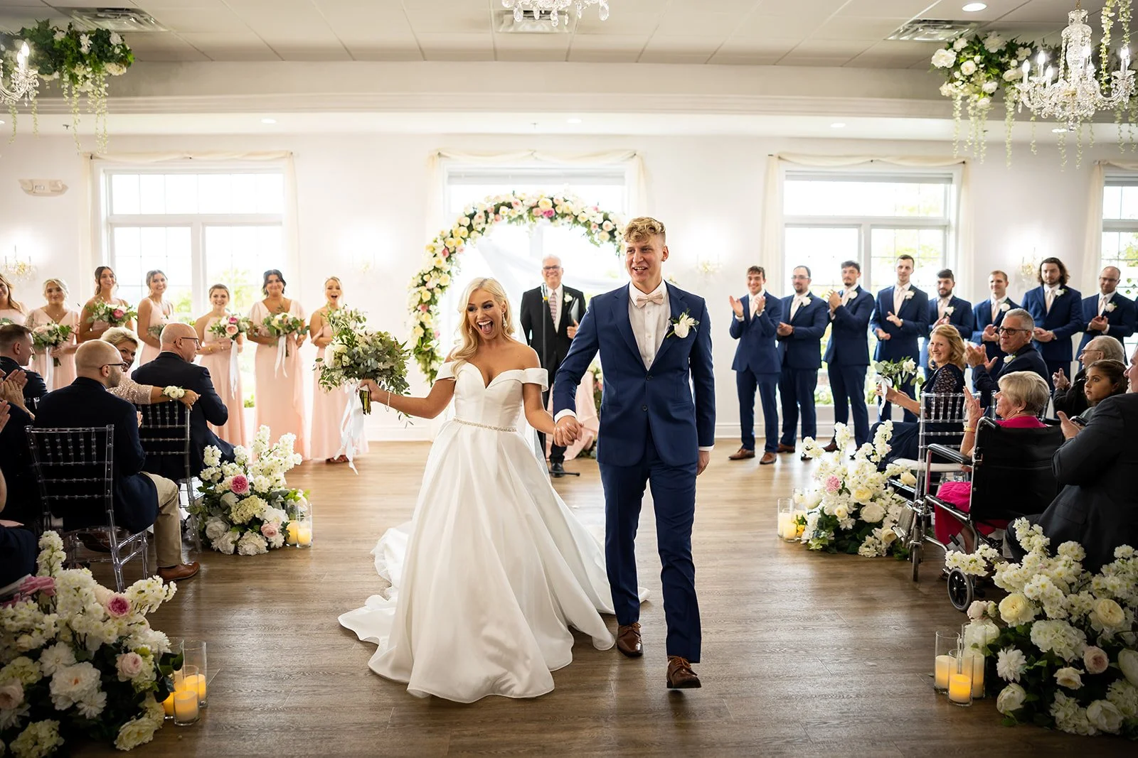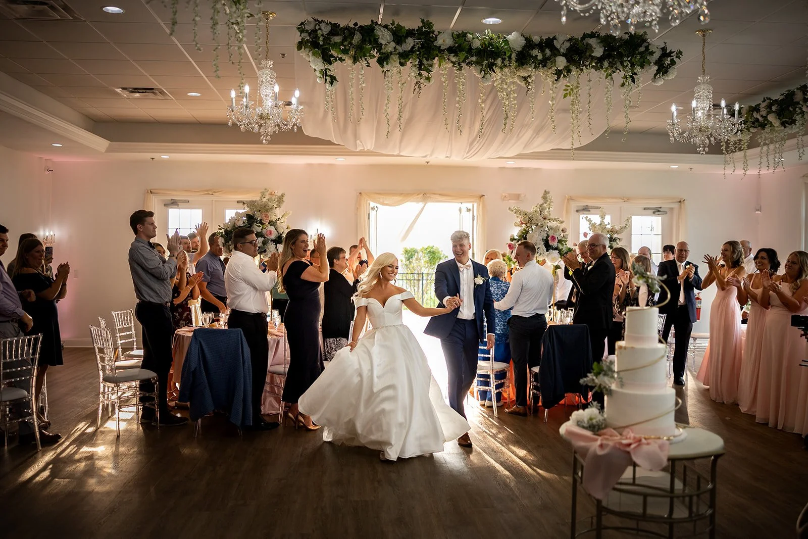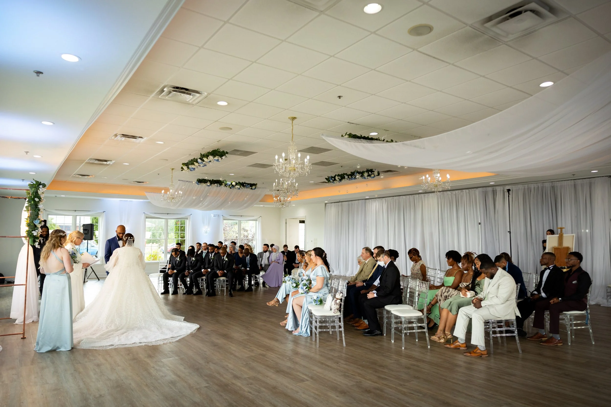 Inside, you are greeted by a Baby Grand piano and elegant marble floors. The picturesque winding stairway leads to the bridal suite and balcony, perfect for your getting-ready photos. The library is the ideal room for your cocktail hour or indoor ceremony. The Grand Ballroom, with its glowing chandeliers and seating for up to 250 guests, is a testament to its ability to accommodate your needs. Windows fill the room, allowing an abundance of natural light, and the space also features an outdoor patio with the most breathtaking views and stunning sunsets.